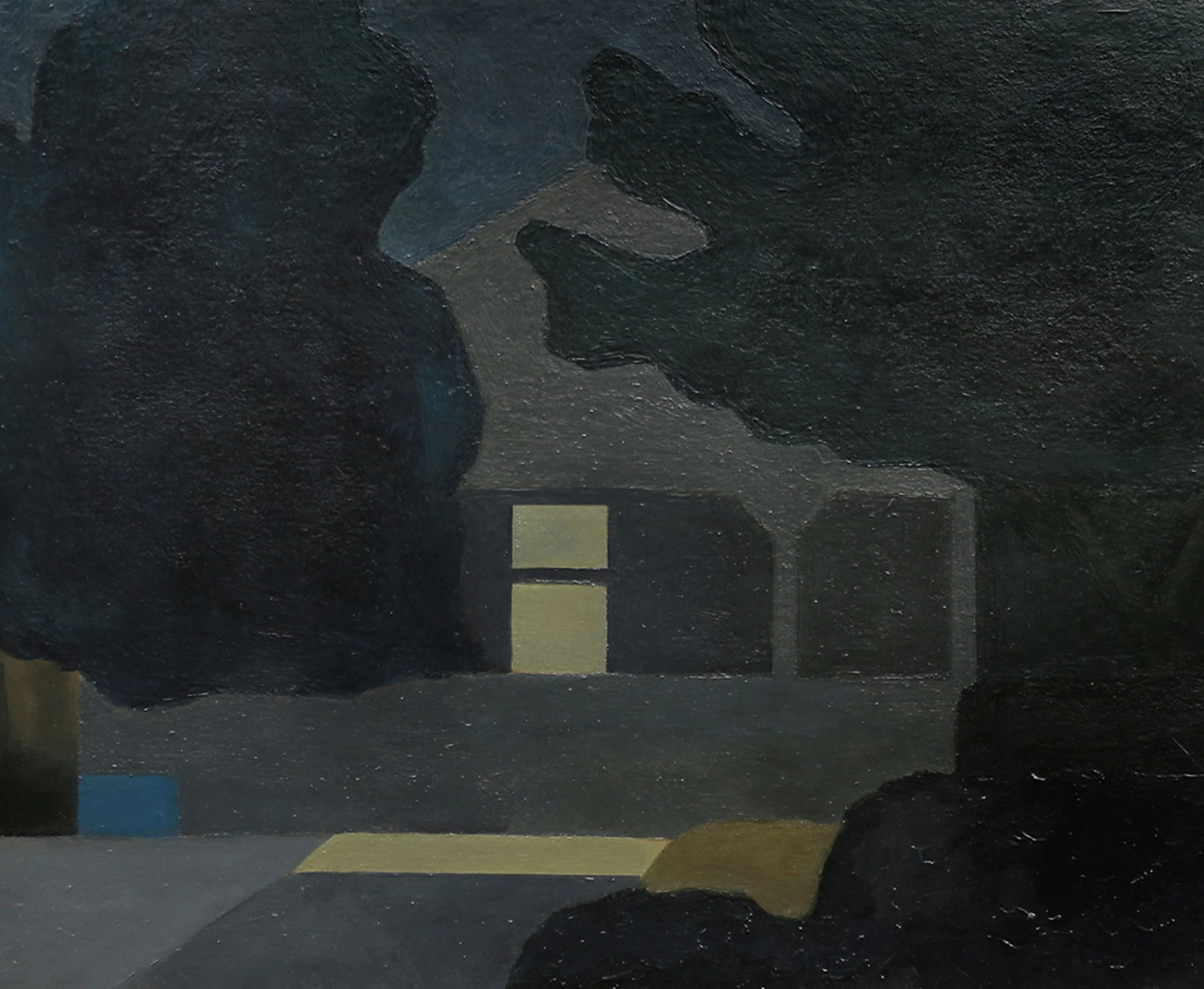 In her paintings, Marcia focuses on unusual compositions to create seemingly simple scenes where all the shapes and colours are in harmony. The absence of people but the inclusion of the built landscape creates a quiet and slightly unsettling feeling.